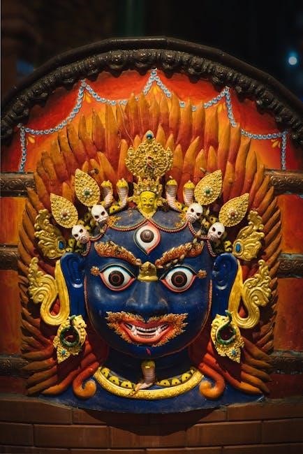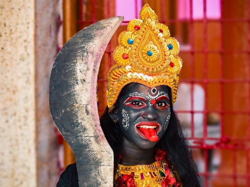 Kalabhairava, detailed in the Ashtakam PDF, represents Shiva’s fierce aspect, embodying time’s destructive power and transcendence within the broader Hindu philosophical framework.