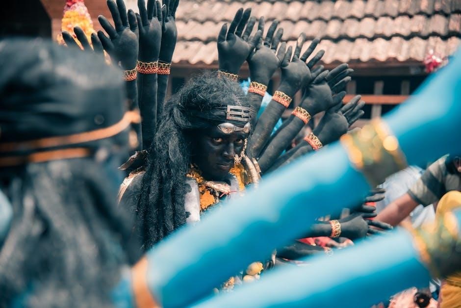 Kalabhairava’s iconography, extensively described within the Kalabhairava Ashtakam – often accessible as a PDF – is strikingly unique and powerfully symbolic. He is traditionally depicted in a naked form, representing complete detachment from worldly illusions and a transcendence of societal norms. This starkness emphasizes his raw, untamed energy.